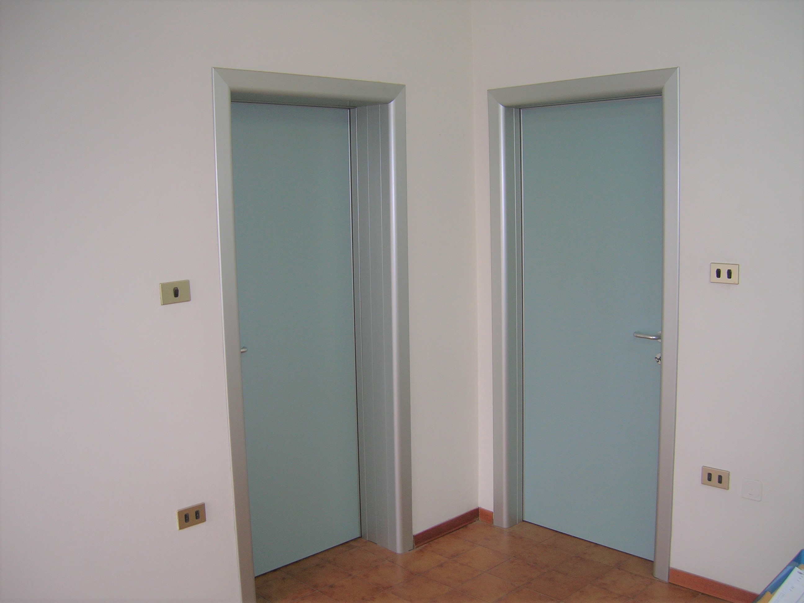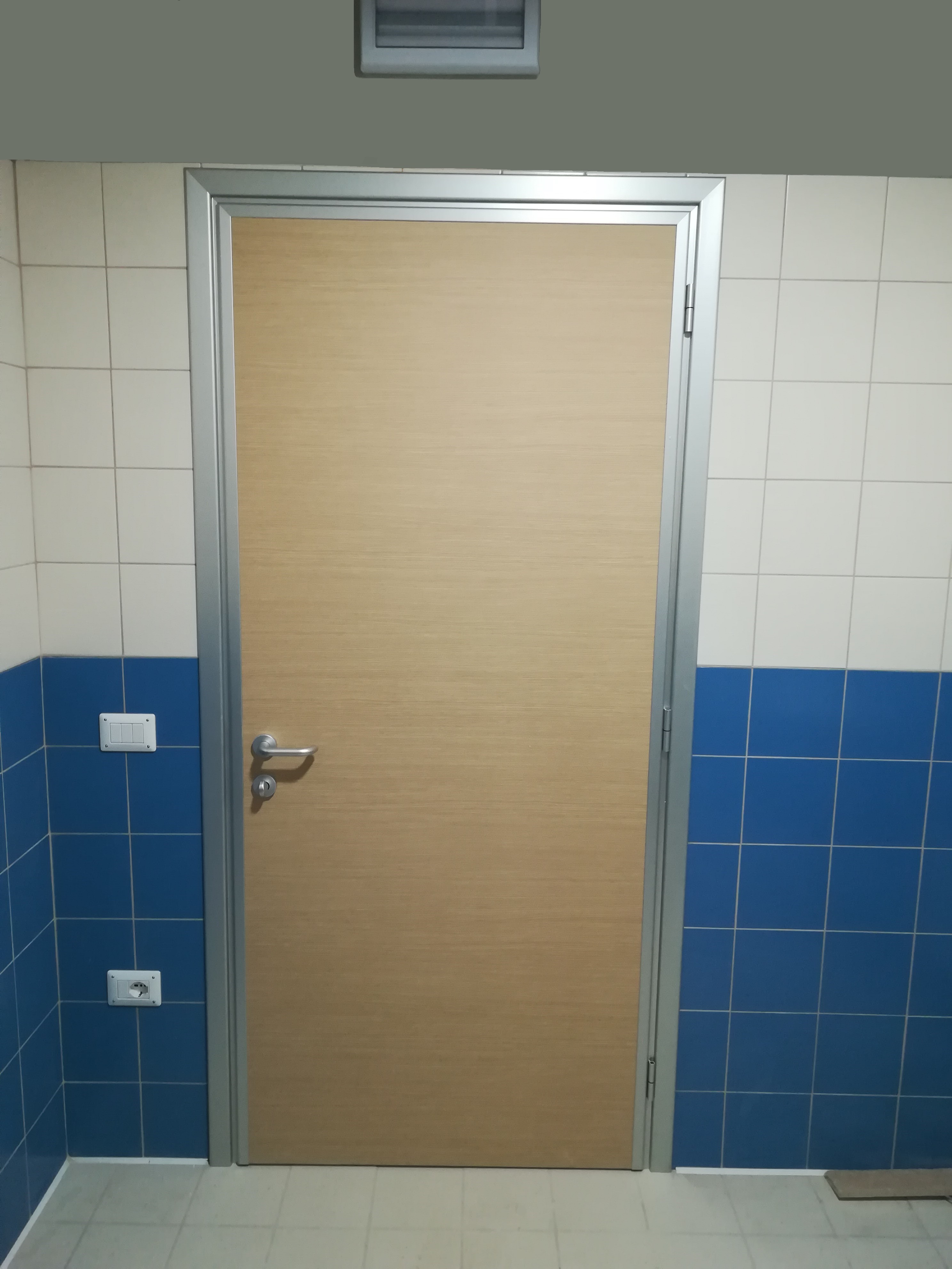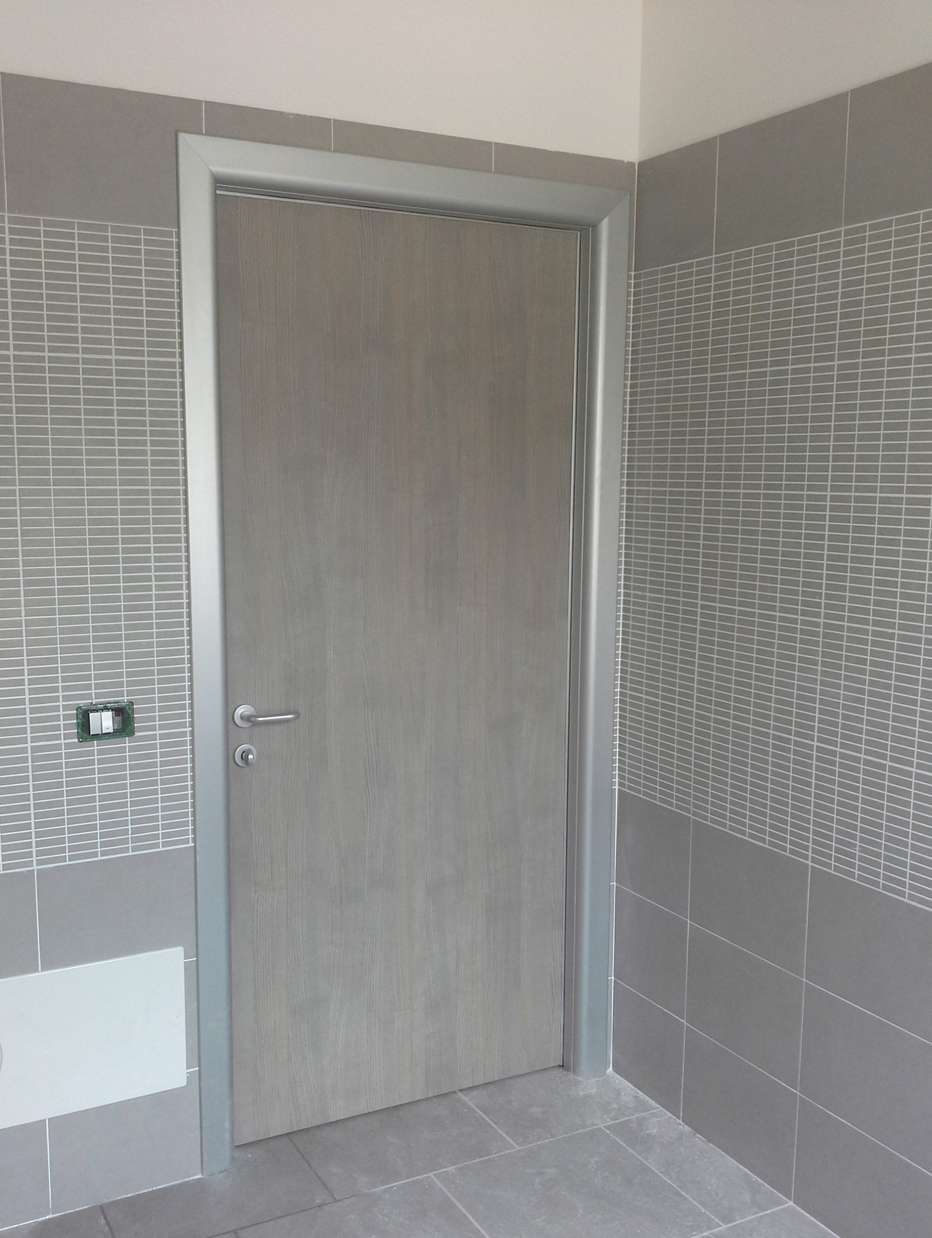 PANNELLO: intelaiatura perimetrale interna realizzata con MDF classe 1 (sez. mm 30/50), riempimento con materassino di polistirene atossico classe 1 (spessore mm 30), sulle facce esterne laminato plastico (spessore 9/10) classe 1, incollato su supporto di MDF classe 1 (spessore mm 4). Bordo perimetrale esterno realizzato con profili estrusi di lega di alluminio 6060 (uni 3569 spessore 20/10) verniciati con vernici a polveri epossidiche e polimerizzati a forno (verniciatura adatta anche per esterni) oppure ossidati argento. La ferramenta è costituita da N° 3 cerniere in alluminio con perno in acciaio registrabili (portata 30 kg cad/una), serratura tipo Patent e maniglia antinfortunistica in alluminio pressofuso con anima in acciaio e molla di ritorno sagomata ad U, ricurva verso l’interno.