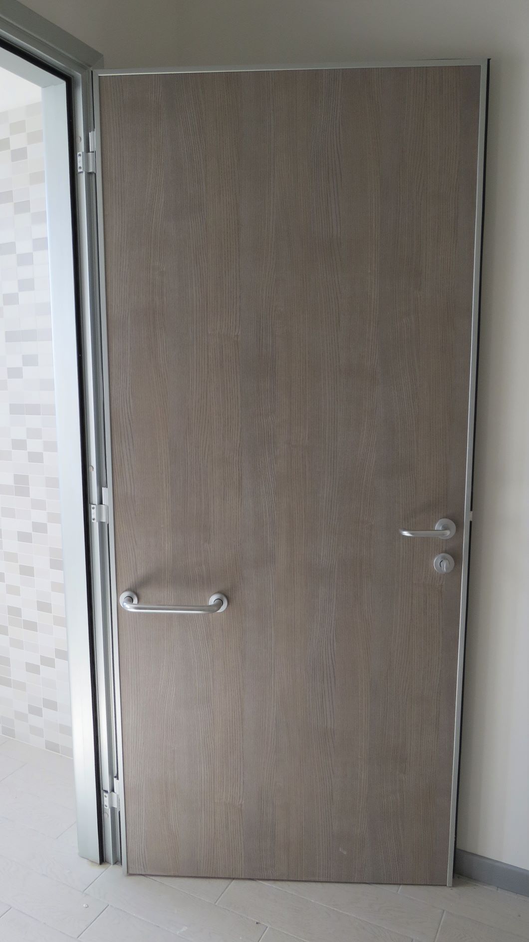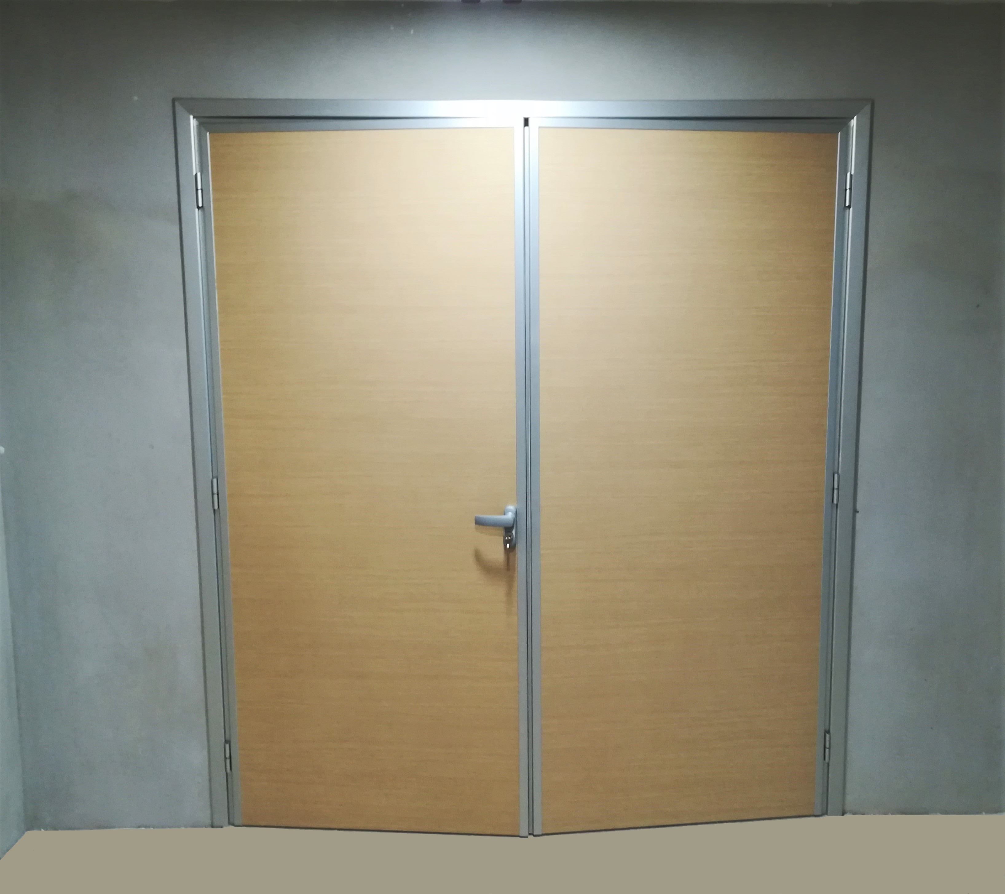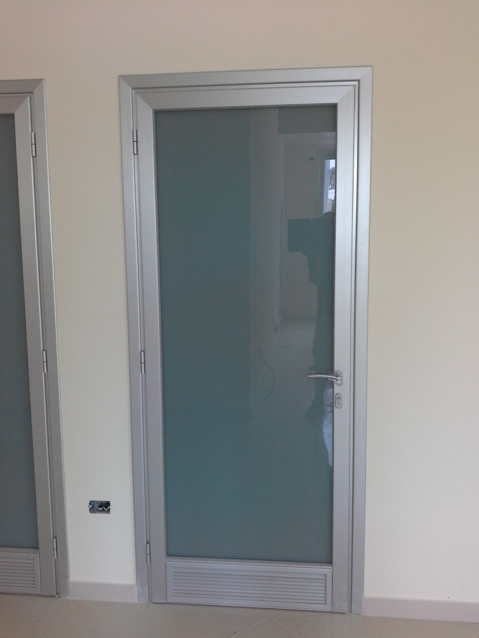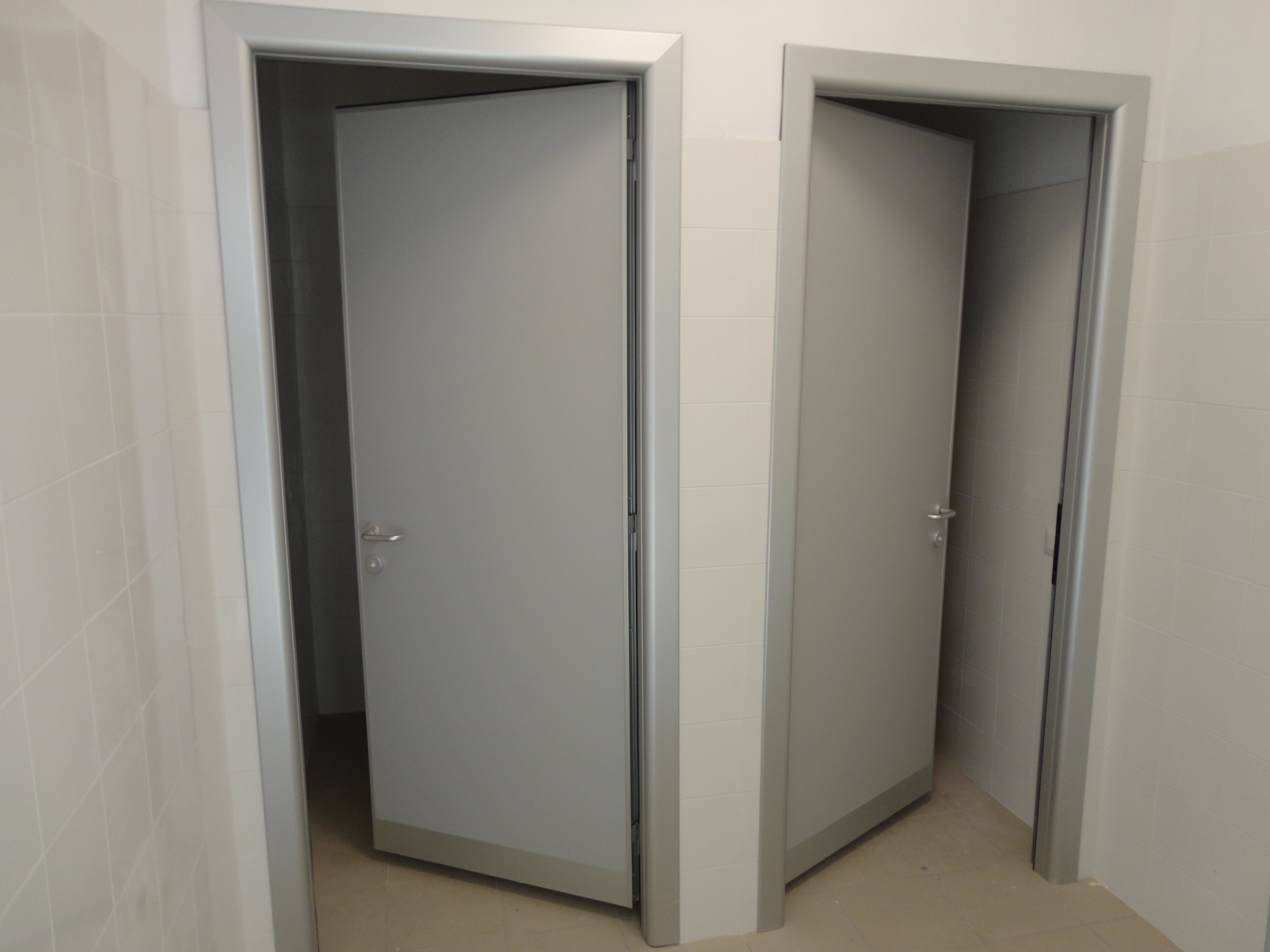 PANNELLO: intelaiatura perimetrale interna realizzata con MDF classe 1 (sez. mm 30/50), riempimento con materassino di polistirene atossico classe 1 (spessore mm 30), sulle facce esterne laminato plastico (spessore 9/10) classe 1, incollato su supporto di MDF classe 1 (spessore mm 4). Bordo perimetrale esterno realizzato con profili estrusi di lega di alluminio 6060 (uni 3569 spessore 20/10) verniciati con vernici a polveri epossidiche e polimerizzati a forno (verniciatura adatta anche per esterni) oppure ossidati argento. La ferramenta è costituita da N° 3 cerniere in alluminio con perno in acciaio registrabili (portata 30 kg cad/una), serratura tipo Patent e maniglia antinfortunistica in alluminio pressofuso con anima in acciaio e molla di ritorno sagomata ad U, ricurva verso l’interno.